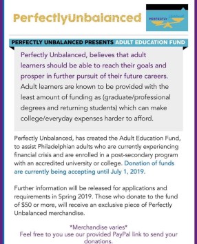 Loren: The adult scholarship is geared towards students who are 18 and older. It’s for adults who are either in graduate school or returning to school. Financial aid is not always the best nor are grants and scholarships guaranteed especially for graduate students, there’s not a lot of ‘free money’ out there. By me being a graduate student I know this for sure and sometimes it can be hard to get the small things that you need for class like the $250-500 fee you have to pay just to start graduate school or the money you need to buy books, a computer, etc. I wanted to do this to give information and assistance to those who need it. It’s to assist Philadelphia adults who are eager to get their degree, eager to continue their education, and have a goal that goes beyond graduation.